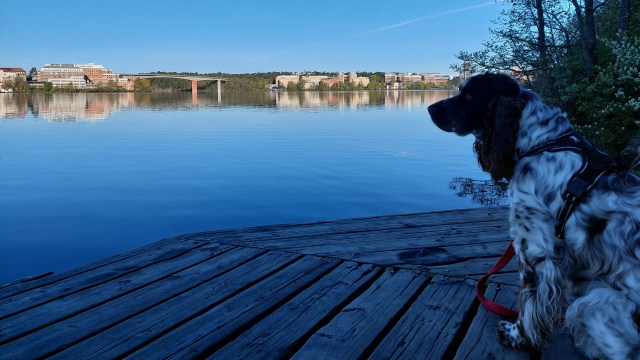 Söndag morgon, jag vaknar klockan fyra. Efter några försök att somna om ger jag upp och kliver ur sängen strax efter klockan 5. Luna är pigg och glad att matte äntligen har vaknat och vi ger oss ut på en morgonpromenad. Först en sväng in på lekplatsen där hon springer efter tennisbollen som jag alltid har med i fickan på morgonen. Hon vet och hon är som alltid ivrig så hon nästan glömmer bort att hon ska kissa. Efter några kast på konstgräset beger vi oss ner till vattnet vid klipporna.