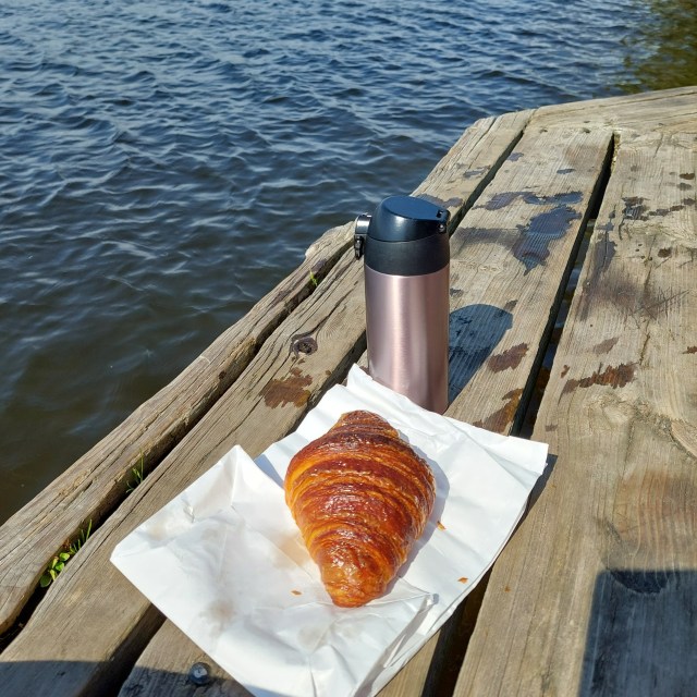 Croissanten och kaffet smakar som vanligt extra gott efter löpturen och badet på bryggan med min finaste och bästa vän. Närvaro, lycka, lugn, tacksamhet.