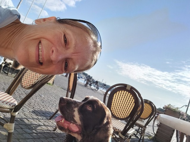 I somras och ända in i september var det varmt så jag försökte springa tidigt på morgonen och alltid längs vatten så vi kunde stanna till och hon kunde svalka tassar och mage. Efter ett stopp piggnade hon alltid till och kunde dra en liten stund.